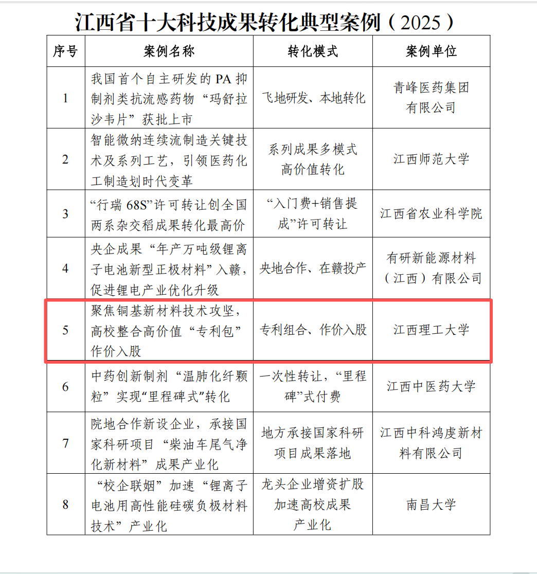 本网讯  在江西省加快推进制造业高质量发展、积极打造国家级先进制造业集群背景下,我校以专利组合为“金钥匙”、以作价入股为“新路径”,在科技成果转化方面取得重要突破。成果转化项目“聚焦铜基新材料技术攻坚,高校整合高价值‘专利包’作价入股”凭借对产业升级的显著推动作用及对成果转化模式的创新突破,成功入选2025江西省十大科技成果转化典型案例,为高校服务地方产业发展树立了示范标杆。