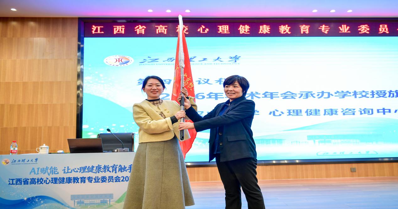 会上还进行了2026年年会承办权交接仪式。我校代表向明年承办单位江西农业大学移交年会旗帜,象征着高校心育事业的薪火相传。江西农业大学心理中心主任张军华作表态发言,感谢专委会信任,承诺将借鉴本次年会的成功经验,全力以赴办好2026年年会。