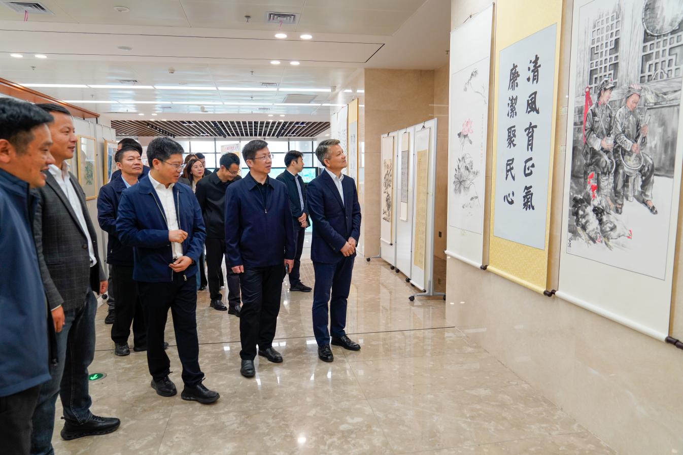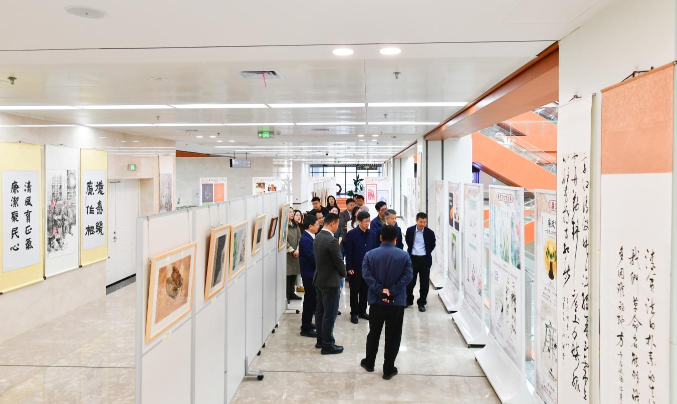 参观过程中,徐志峰详细了解了本次作品展的创作对象以及面向群体,品鉴了书法与绘画等系列作品内涵,对展览内容表示了肯定,并从作品呈现与传播形式提出具体指导意见。他指出,要丰富作品内容维度,探索多元传播路径,进一步贴近师生群体,推动廉洁文化作品进宿舍、进走廊等公共场景,采用通俗易懂、直白生动的呈现形式,增强作品教育意义与传播效果。同时,在廉洁作品的创作及传播过程中,不仅要发挥正面典型、先进榜样的模范带头作用,而且要充分发挥反面典型案例的警示震慑作用,营造校园廉洁氛围。