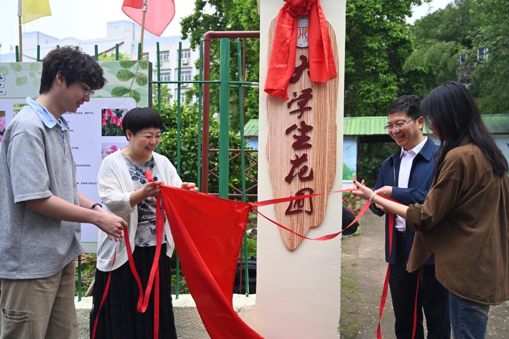 刘飞、宁洁与学生代表共同为大学生花圃揭牌。随着红绸缓缓落下,“大学生花圃”牌匾在春光中熠熠生辉。花圃与八角塘相映成趣,更与三江校区大学生公园、鹰潭铜芯农场联动互补,形成我校劳动教育由点及面、全域覆盖的育人新格局。