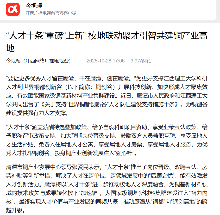 《江西网络广播电视台》:“人才十条”重磅“上新” 校地联动聚才引智共建铜产业高地