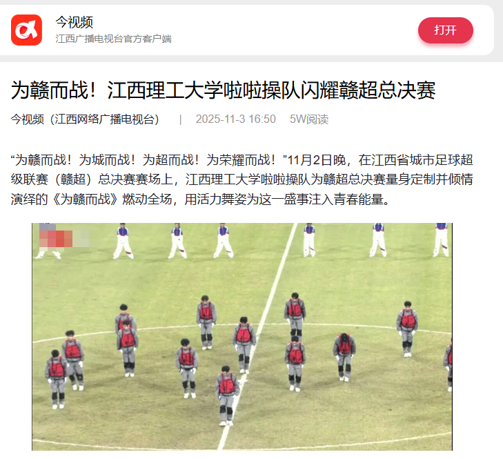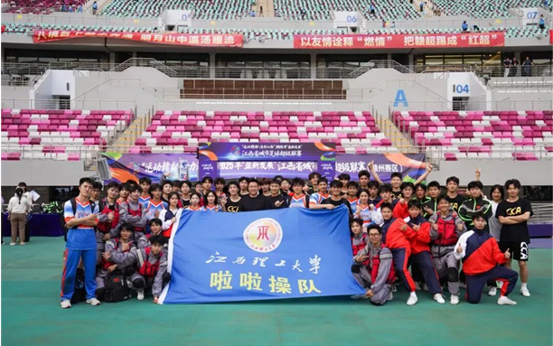 江西理工大学啦啦队助理教练刘炜表示:“希望通过这次表演,向全省球迷传递青春自信、团队拼搏与健康快乐的体育精神,也展现出在赣州这片红色土地上江理青年的奋进力量。”未来,江西理工大学啦啦操队将继续奋进在专业赛事竞技、运动宣传推广的道路上,以更多高水平赛事和表演,为推广体育精神、展现青年学子风采搭建更多平台。(文/蓝浩铭、孙瑞 图/朱婷婷、刘家豪、张泽鑫)