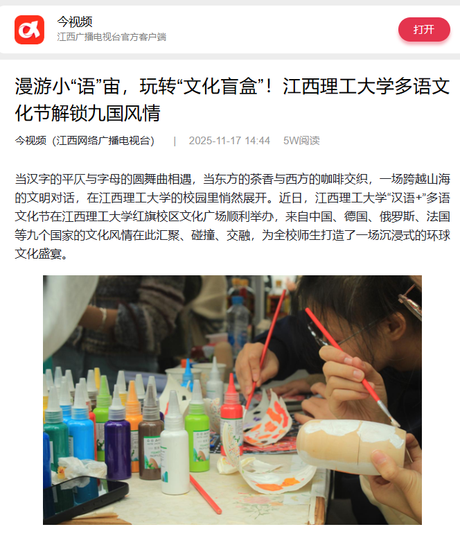 这场跨文化交流,是江西理工大学以文化为纽带的生动实践——它将语言学习与文化体验深度融合,使跨文化对话从课堂走向生活,真正把校园打造成可感可知的“世界课堂”。未来,江西理工大学将持续以语言为媒、以交流为桥,搭建更广阔的文明对话平台,让多元文化在江理校园碰撞共鸣,助力学子在开放视野中厚植文化自信,成长为兼具跨文化素养的时代新青年。(文/钱敏霞、周礼李 图/姜美玲、尧玉婷)