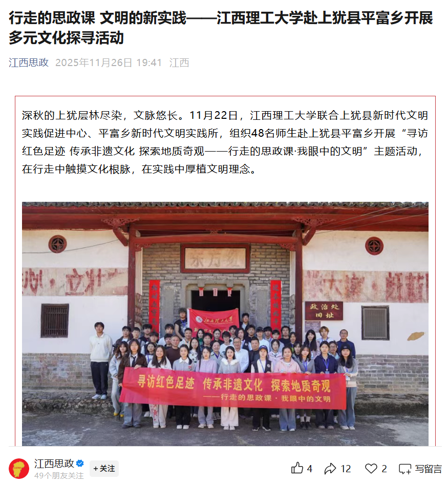【江西思政微信公众号】:行走的思政课 文明的新实践——江西理工大学赴上犹县平富乡开展多元文化探寻活动