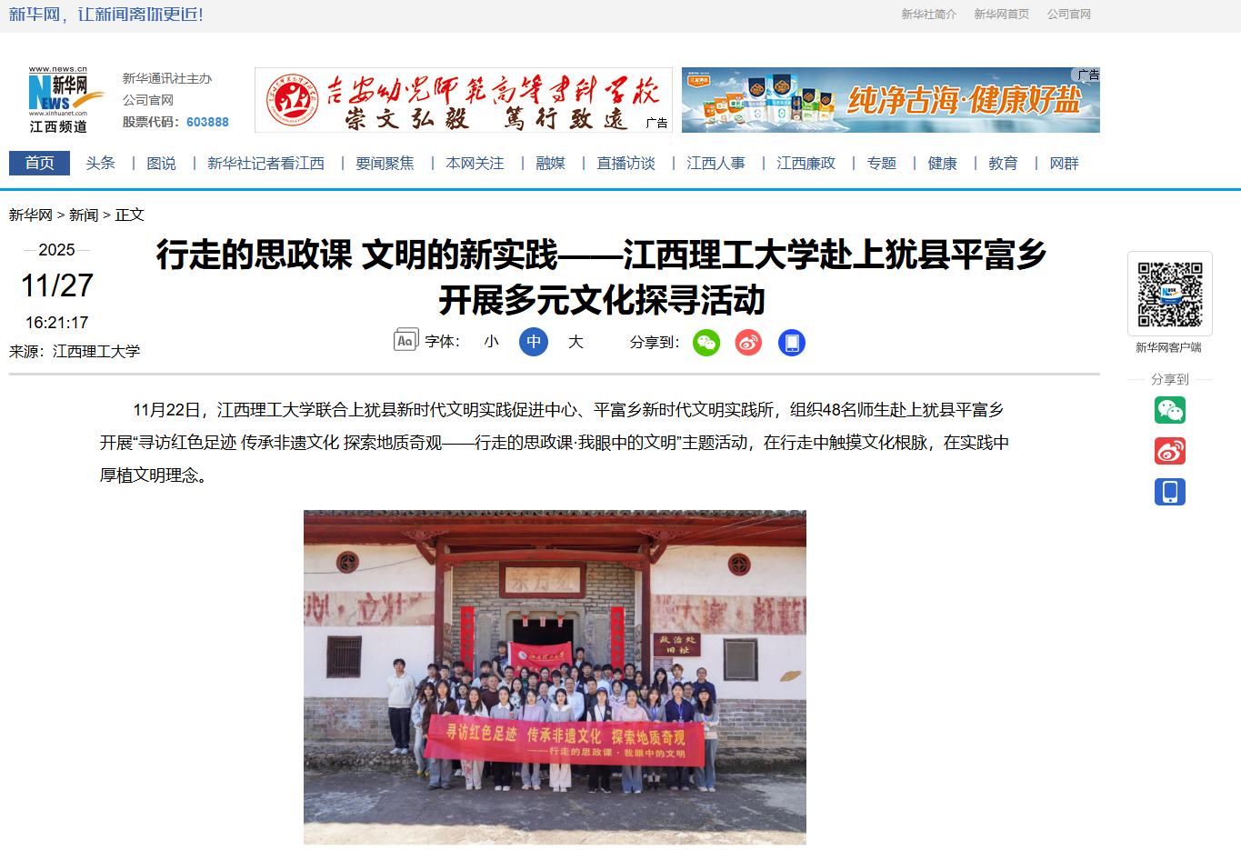 11月22日,江西理工大学联合上犹县新时代文明实践促进中心、平富乡新时代文明实践所,组织48名师生赴上犹县平富乡开展“寻访红色足迹 传承非遗文化 探索地质奇观——行走的思政课·我眼中的文明”主题活动,在行走中触摸文化根脉,在实践中厚植文明理念。