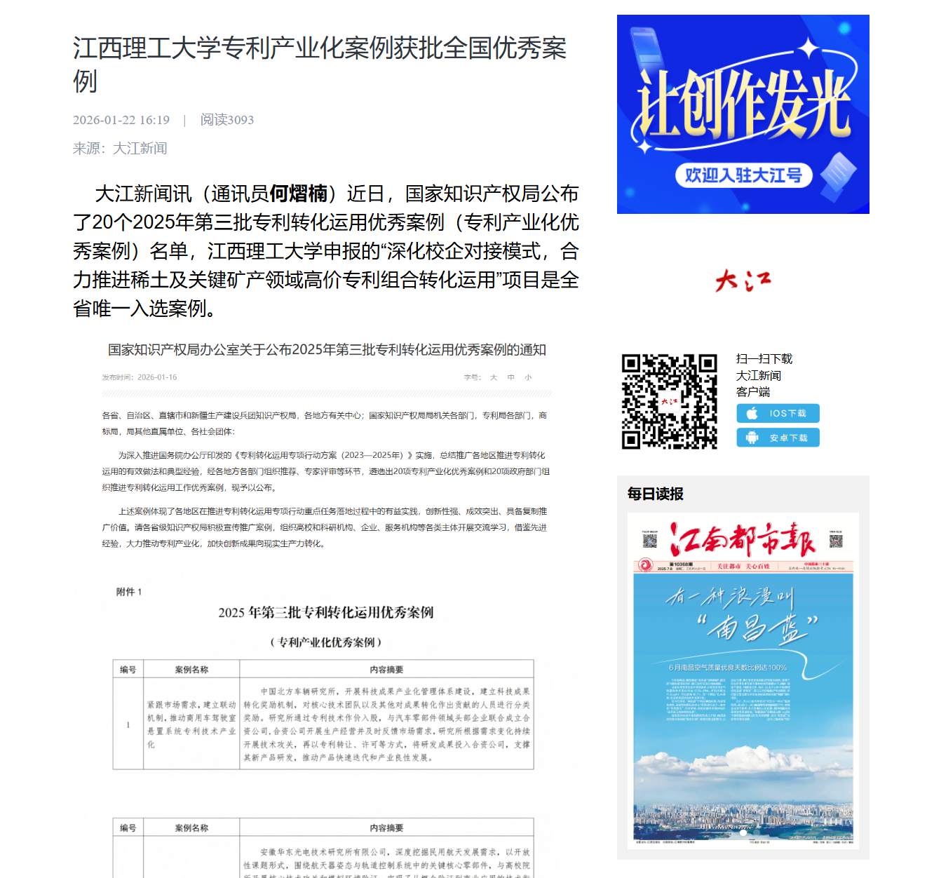 大江新闻讯(通讯员何熠楠)近日,国家知识产权局公布了20个2025年第三批专利转化运用优秀案例(专利产业化优秀案例)名单,江西理工大学申报的“深化校企对接模式,合力推进稀土及关键矿产领域高价专利组合转化运用”项目是全省唯一入选案例。