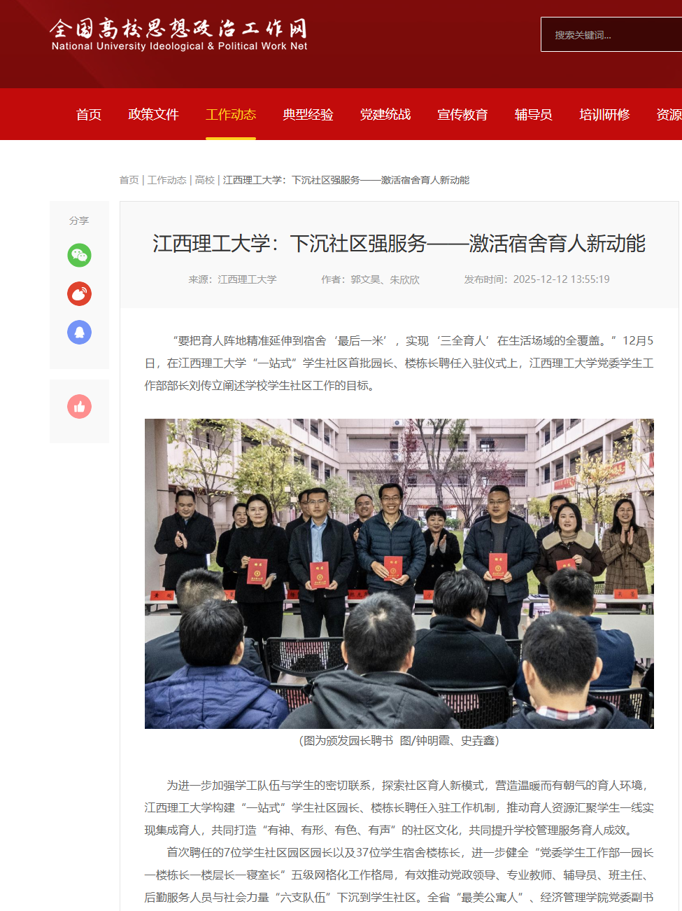 “要把育人阵地精准延伸到宿舍‘最后一米’,实现‘三全育人’在生活场域的全覆盖。”12月5日,在江西理工大学“一站式”学生社区首批园长、楼栋长聘任入驻仪式上,江西理工大学党委学生工作部部长刘传立阐述学校学生社区工作的目标。