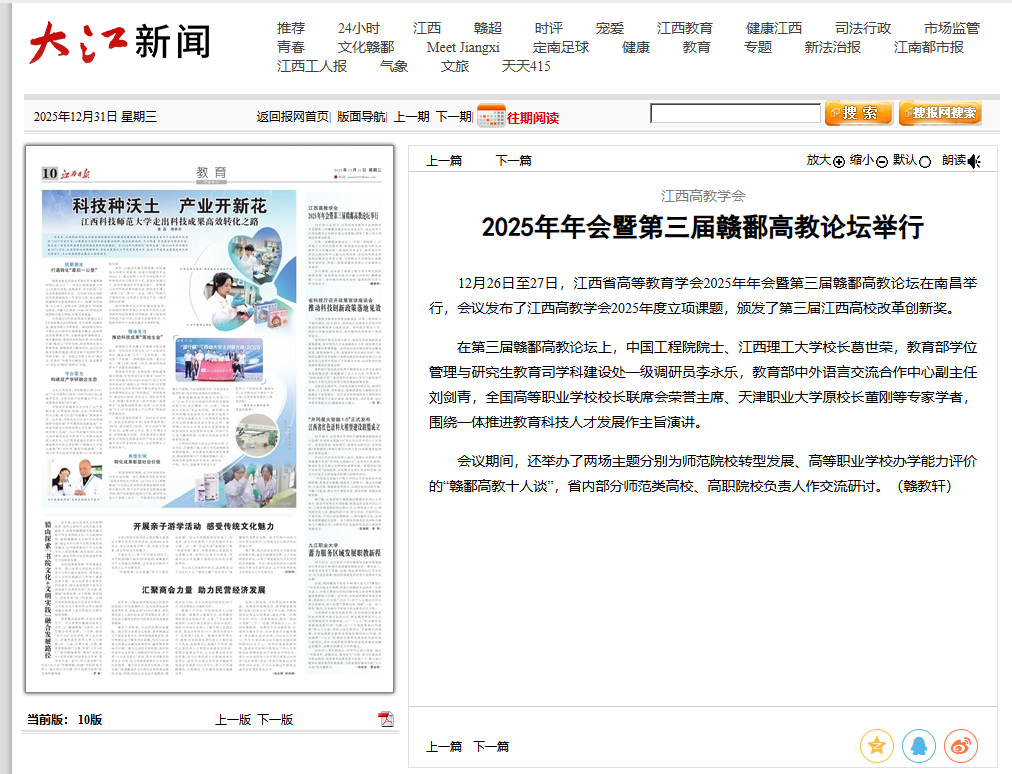 12月26日至27日,江西省高等教育学会2025年年会暨第三届赣鄱高教论坛在南昌举行,会议发布了江西高教学会2025年度立项课题,颁发了第三届江西高校改革创新奖。