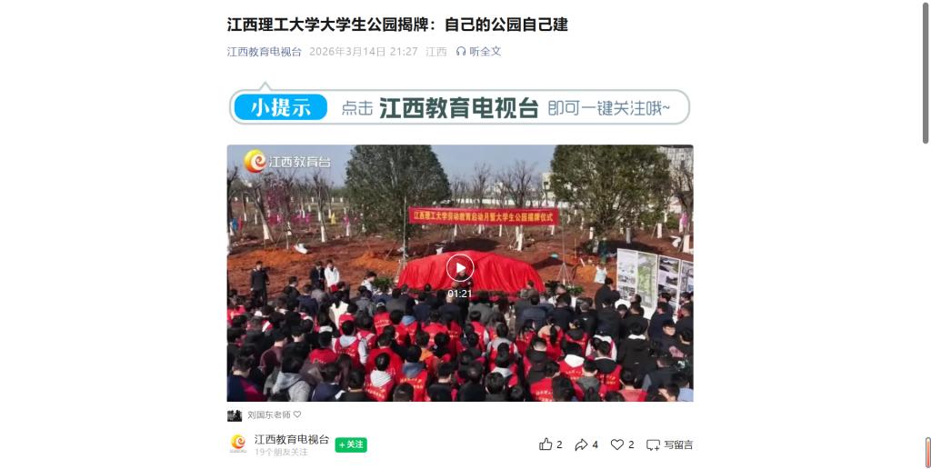 《江西教育电视台》:江西理工大学大学生公园揭牌:自己的公园自己建