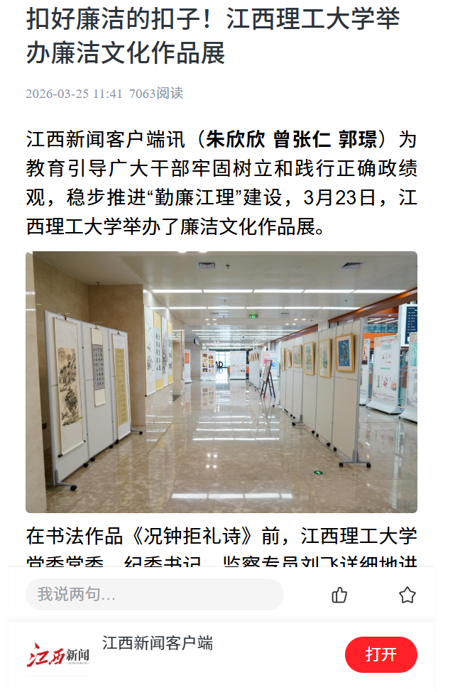 此次展览集中展出了江西理工大学在教育部第十届高校廉洁教育系列活动中的获奖作品、学校师生创作的系列廉洁文化作品及校外优秀廉洁文化作品,作品涵盖书法、绘画、海报、创意设计等形式,既彰显了学校党员干部廉洁自律、担当作为的先锋本色,也承载着青年学子廉洁修身、笃行向善的青春追求。