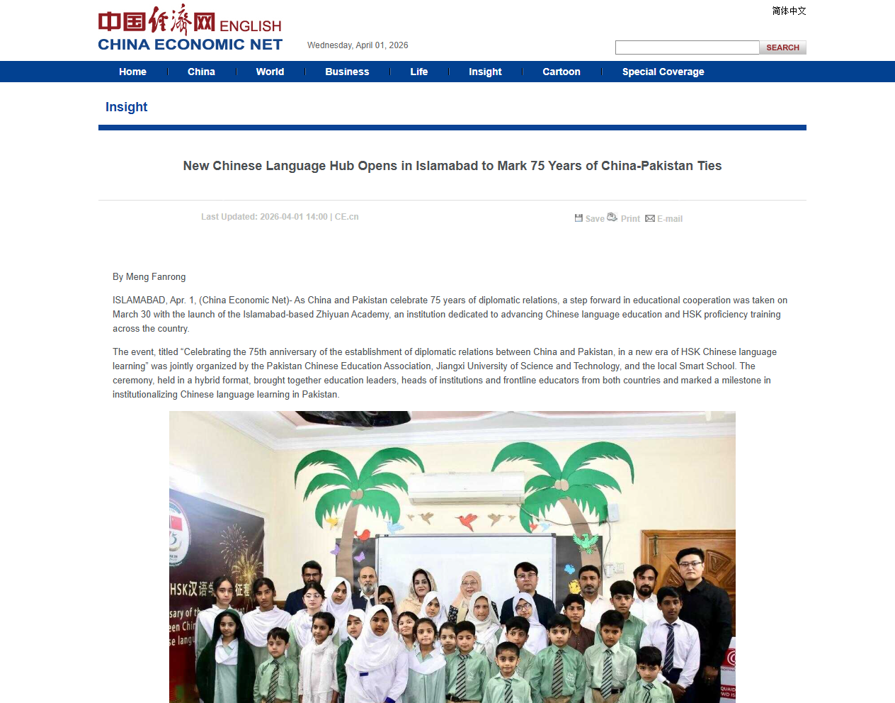 ISLAMABAD, Apr. 1, (China Economic Net)- As China and Pakistan celebrate 75 years of diplomatic relations, a step forward in educational cooperation was taken on March 30 with the launch of the Islamabad-based Zhiyuan Academy, an institution dedicated to advancing Chinese language education and HSK proficiency training across the country.