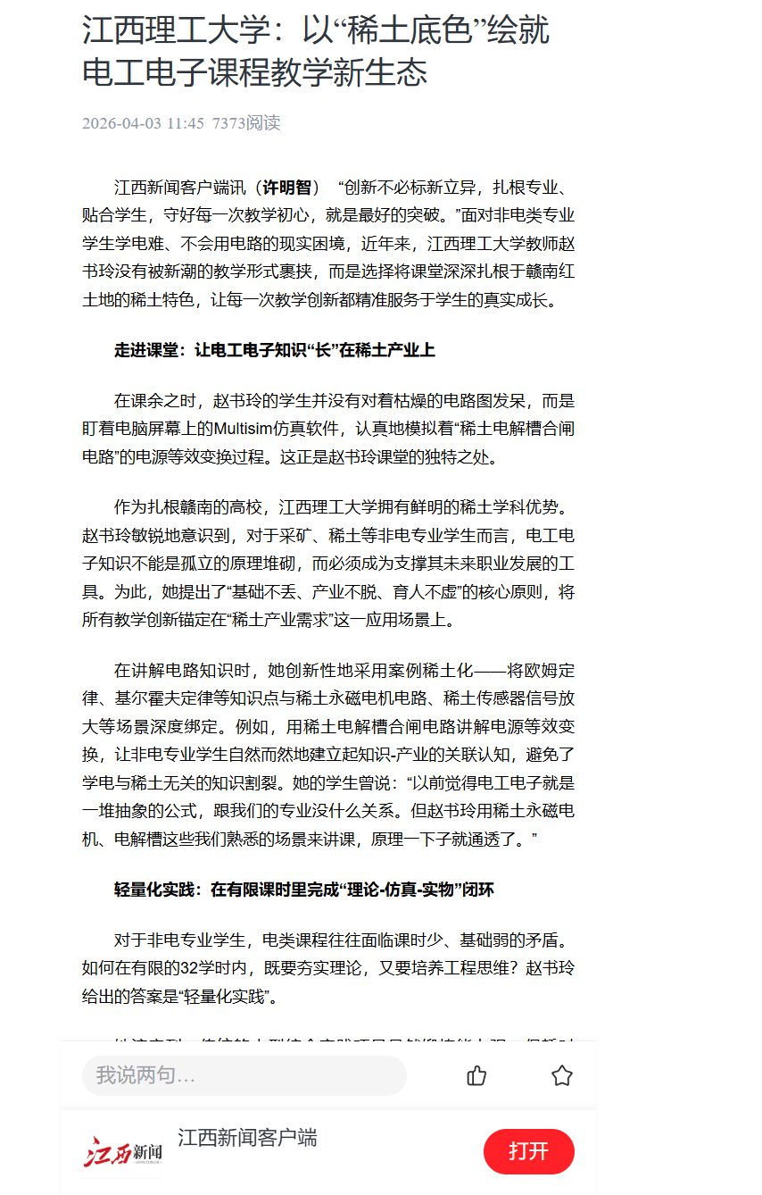 【江西新闻客户端】:江西理工大学:以“稀土底色”绘就电工电子课程教学新生态