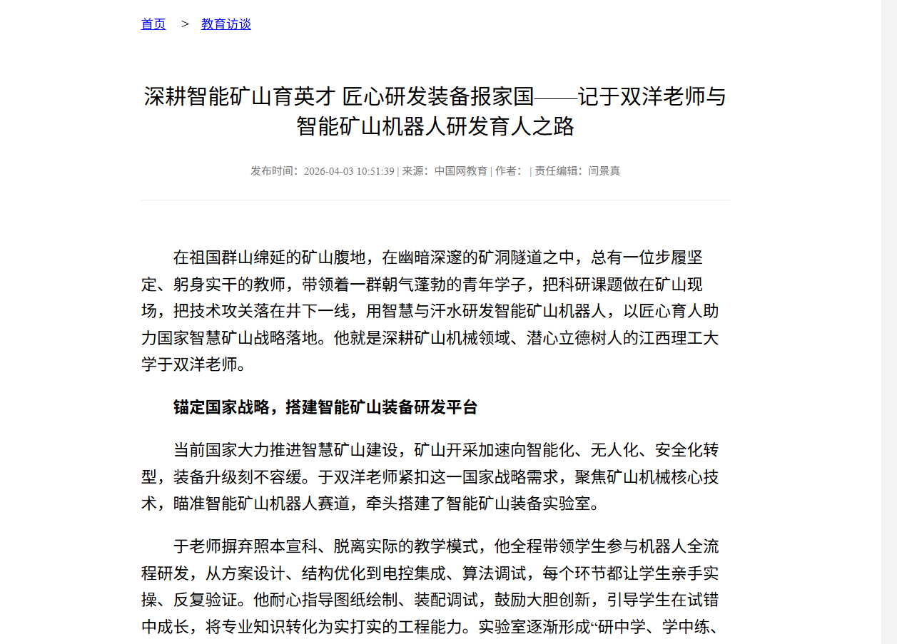 《中国网》:深耕智能矿山育英才 匠心研发装备报家国——记于双洋老师与智能矿山机器人研发育人之路