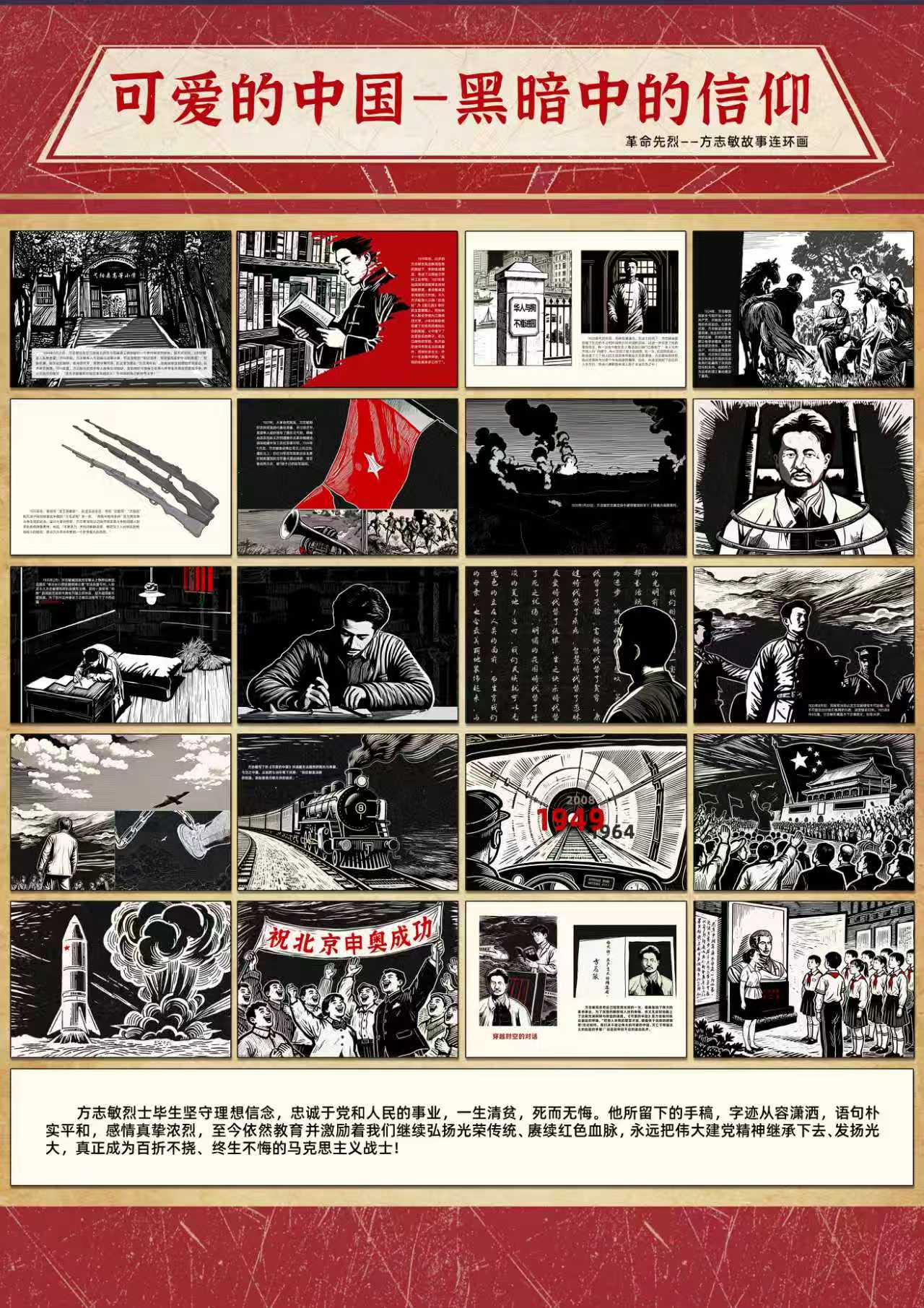 据悉,获奖作品《黑暗中的信仰》以无产阶级革命家方志敏烈士的人生轨迹为核心叙事线索,通过细腻的画面和生动的笔触,全景式再现了方志敏从少年求学立志、毅然投身革命洪流,到身陷囹圄仍坚守信仰、挥笔书写家国情怀的壮阔一生。作品在创作手法上独具匠心,尤其在结尾处设计了一组跨越时空的视觉对比:前一页完整呈现方志敏烈士在狱中写下的“可爱的中国”经典文字愿景,后一页则以写实风格描绘出当代中国高铁飞驰、高楼林立、人民笑容绽放的繁华图景,直观而有力地展现出烈士当年的理想已然成为美好现实,引发观者强烈的情感共鸣。