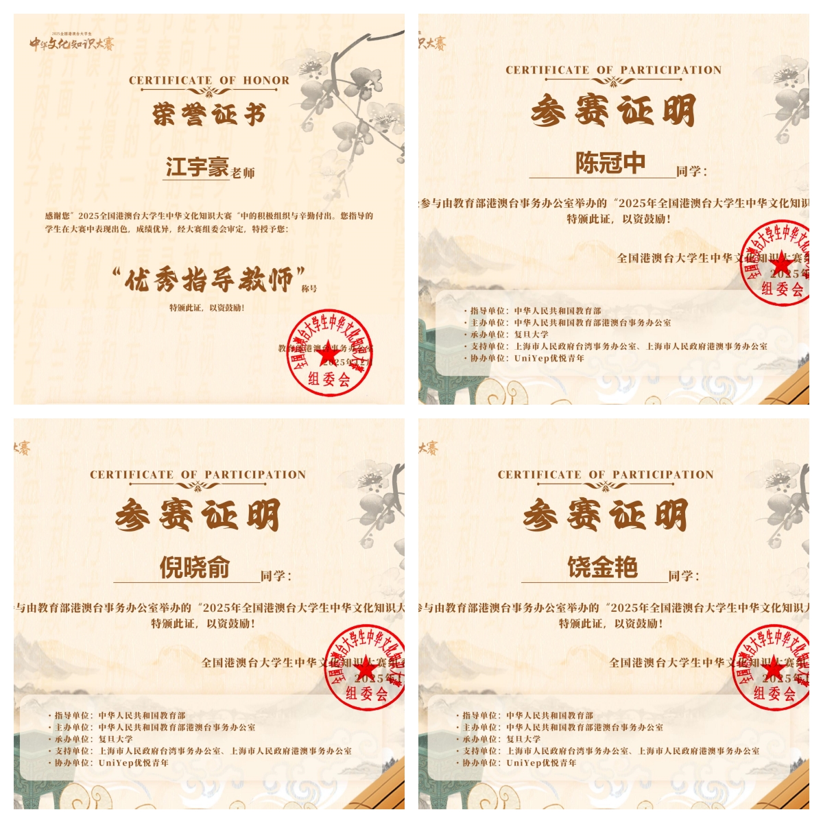 本网讯 近日,由教育部港澳台事务办公室主办、复旦大学承办的2025年内地(大陆)高校港澳台学生中华文化知识大赛顺利落幕。我校在本届大赛中表现优异,荣获“最佳组织奖”。外国语学院江宇豪老师获评“优秀指导老师”,所有参加全国复赛的学生均获得参赛证书。充分体现了学校在推动港澳台学生文化交流、促进中华文化传承方面取得的扎实成效。